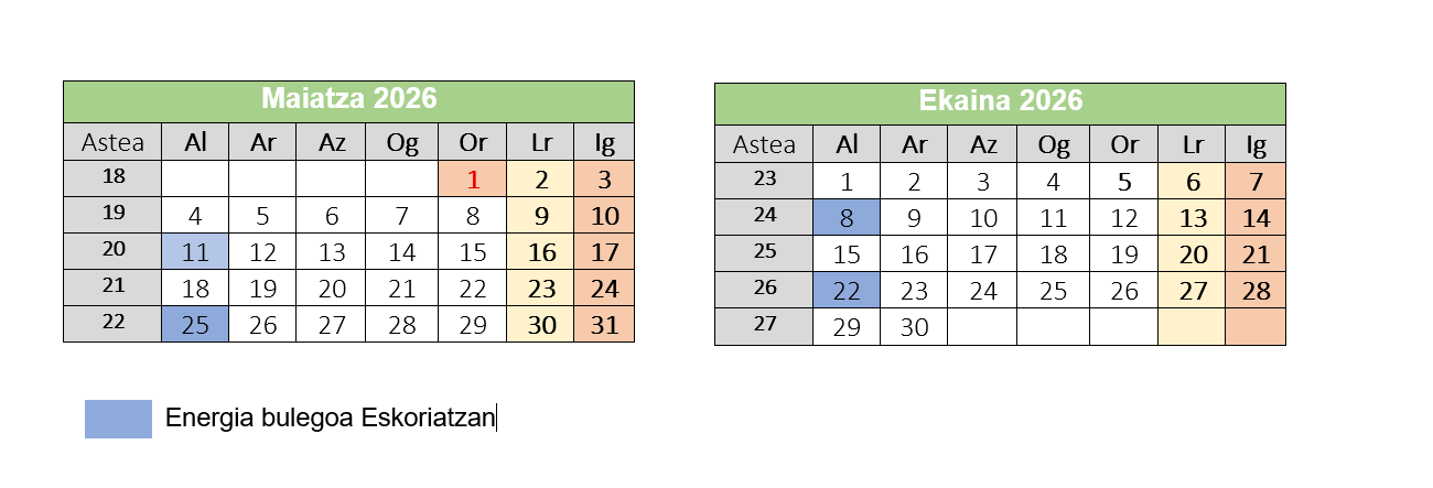 Udaberriarekin batera, egutegi eta ordutegi aldaketa izango du energia bulegoak. Hamabostean behin emango da zerbitzua herri bakoitzean. Honenbestez, Eskoriatzan aste bikoitietako astelehenetan egongo da (kontsultatu webgunean).